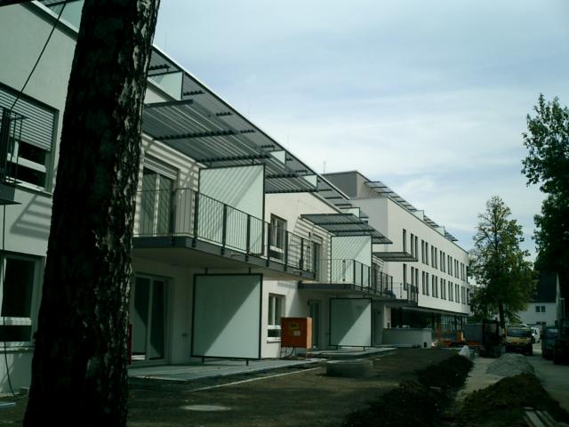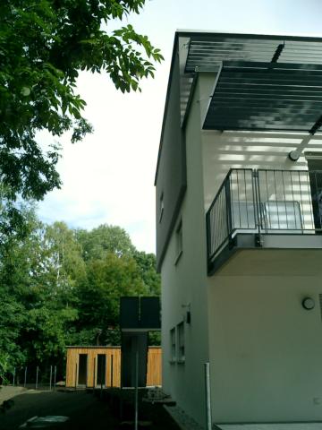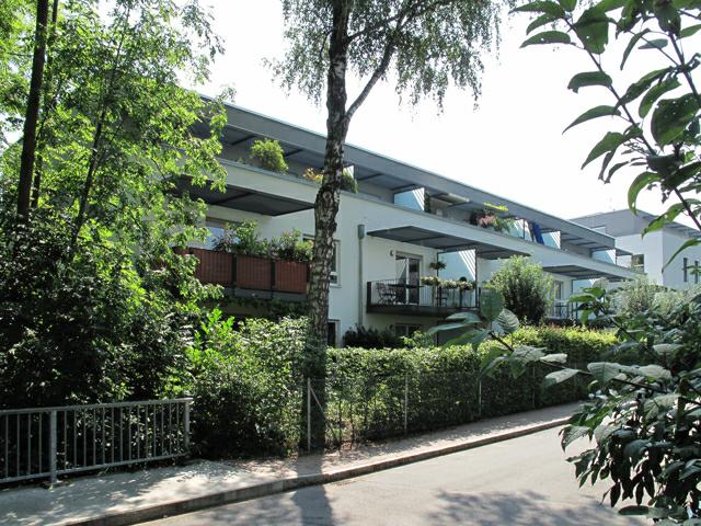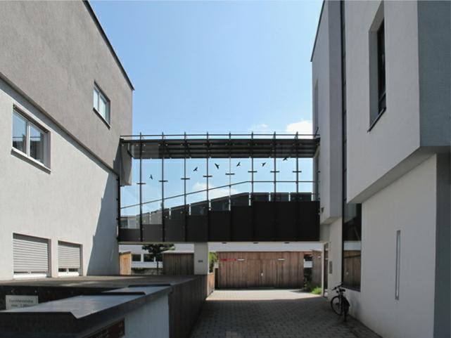 Um die relativ hohe Baumasse auf dem recht beengtem Grundstück städtebaulich harmonisch zu integrieren, gliedert sich der