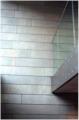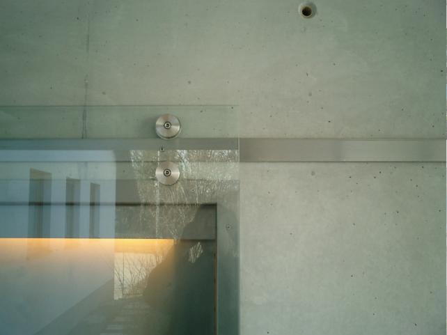 Das gesamte Foyer ist mit großflächigen Natursteinplatten belegt. Die Sichtbetondecken sind mit einer Spachteltechnik