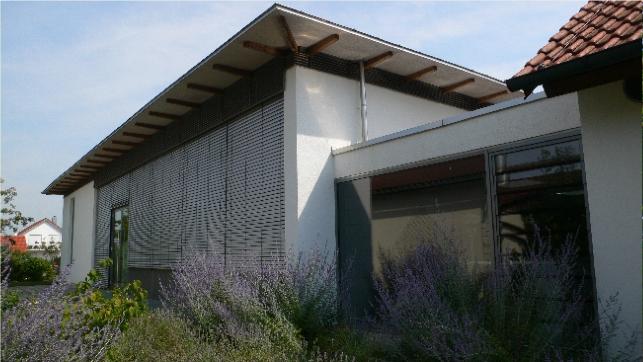der Ostseite laufendes Oberlichtband mit integrierten Lamellenfenstern zur Lüftung und eine großzügige Glasfassade als